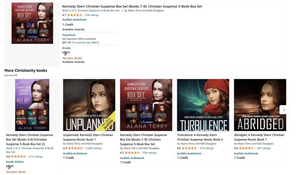 Alana: I like to advertise on books in my series. I’ve got a nine-book Christian suspense series, so if you visit any of those book sales pages, most days, you’ll see ads for the eight other books in that series on that page.